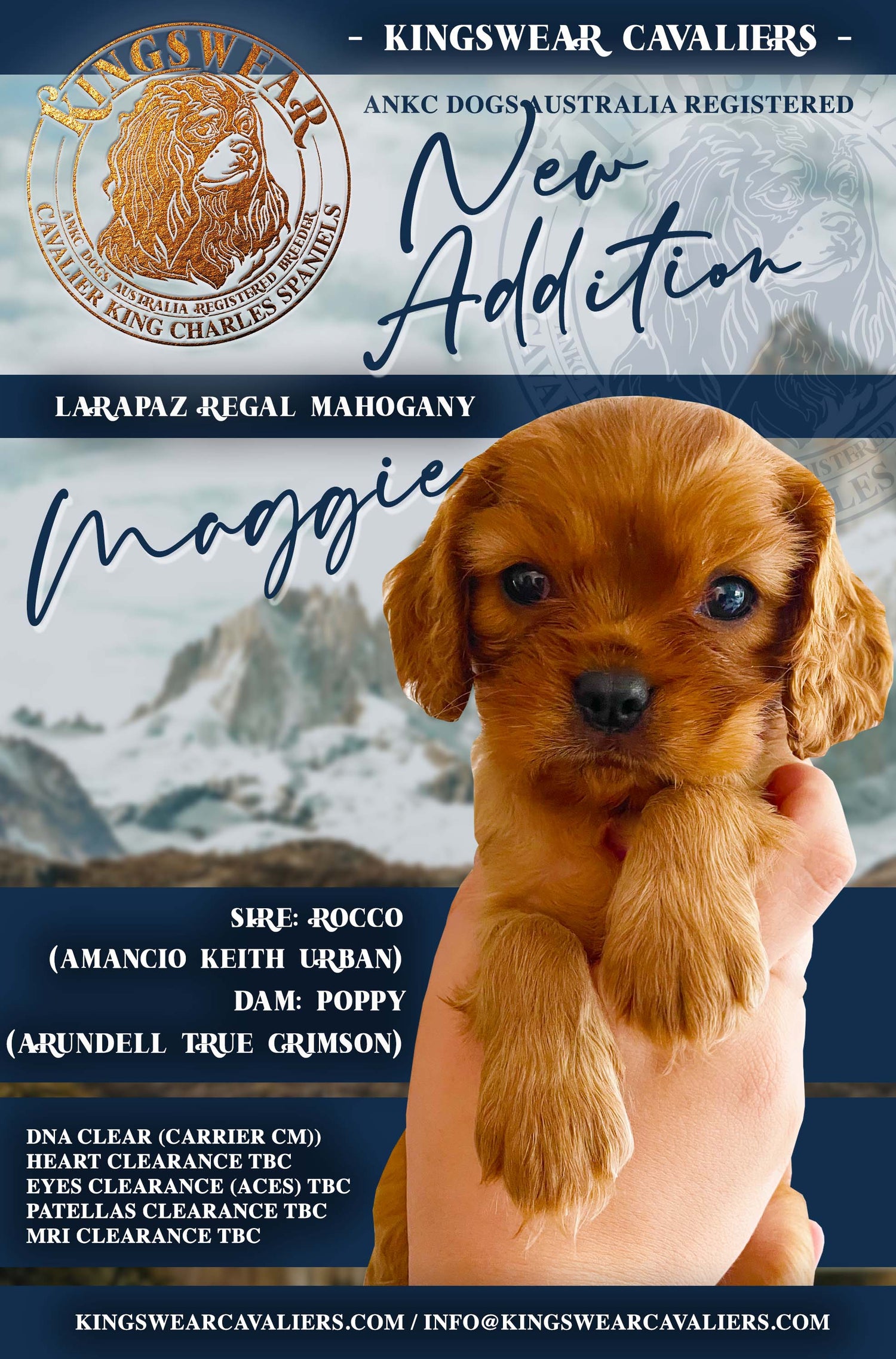 Maggie is a pure Ruby coloured Cavalier bred by Lisa and Paris of Larapaz Cavaliers in NSW.